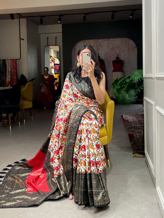 Black Color Dola Silk Saree With Patota Print and Foil Work With Blouse By WTW