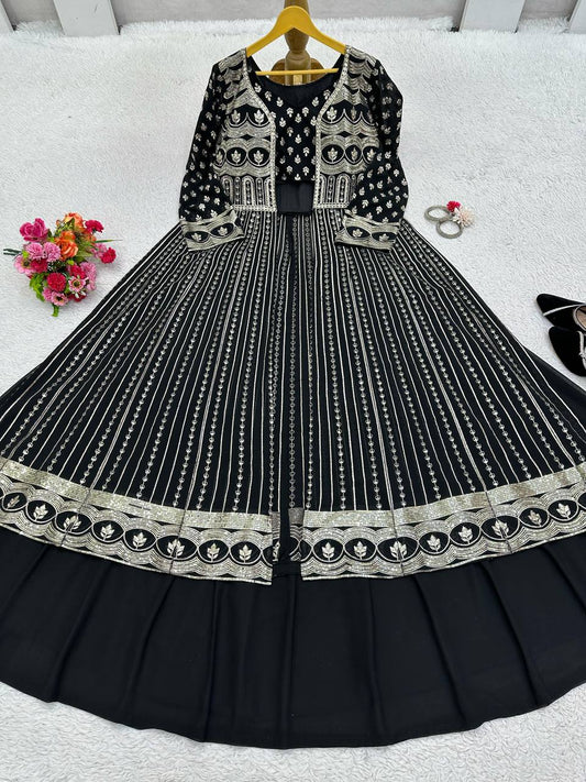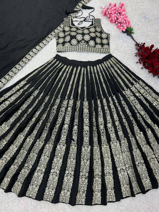 Black Color Sequins And Thread Embroidery Work Georgette Lehenga Choli By WTW