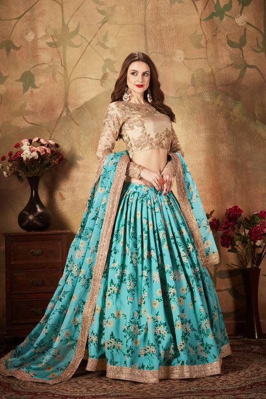 Sky Blue Floral Digital Printed Organza Wedding Wear Lehenga Choli By WTW
