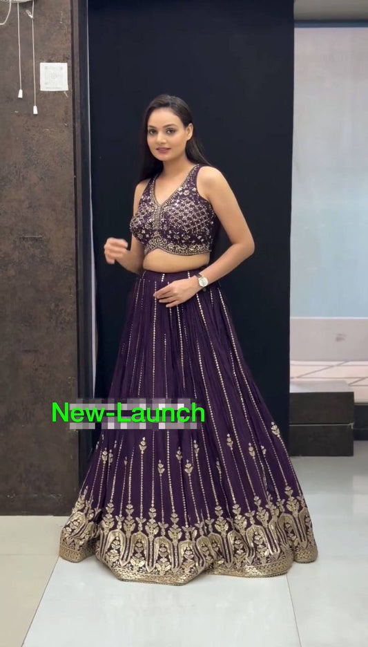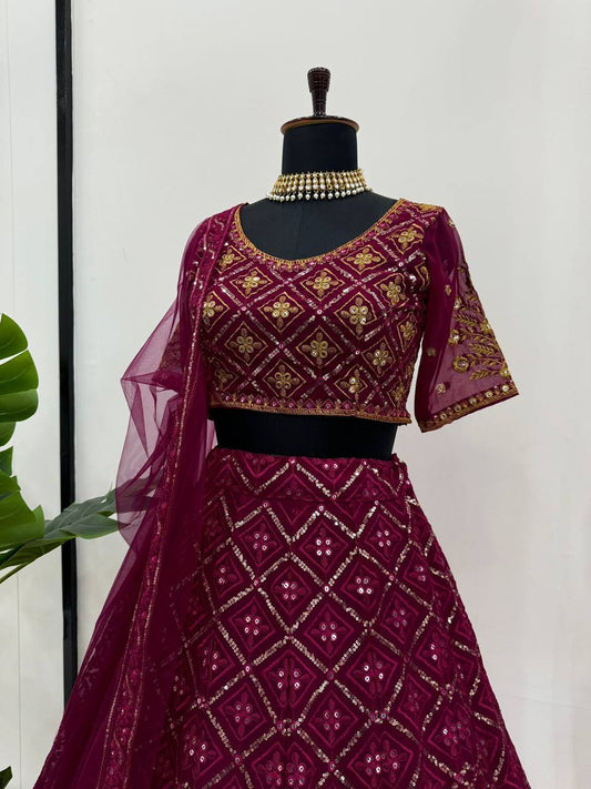Wine Color Georgette Embroidered Semi Stitched Lehenga Choli By WTW