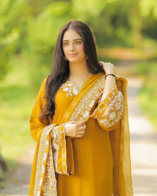 Yellow Maska Silk Embroidery Sharara Suit And Dupatta Set By WTW