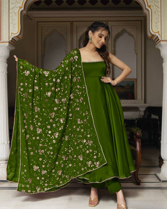 Green Faux Georgette Sequence Embroidery Work Gown With Dupatta Set By WTW
