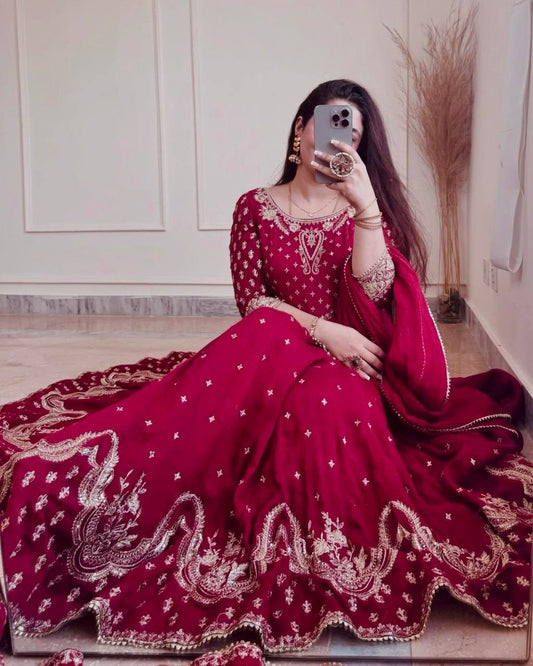Georgette Anarkali Red Gown With Jari Embroidery Work By WTW