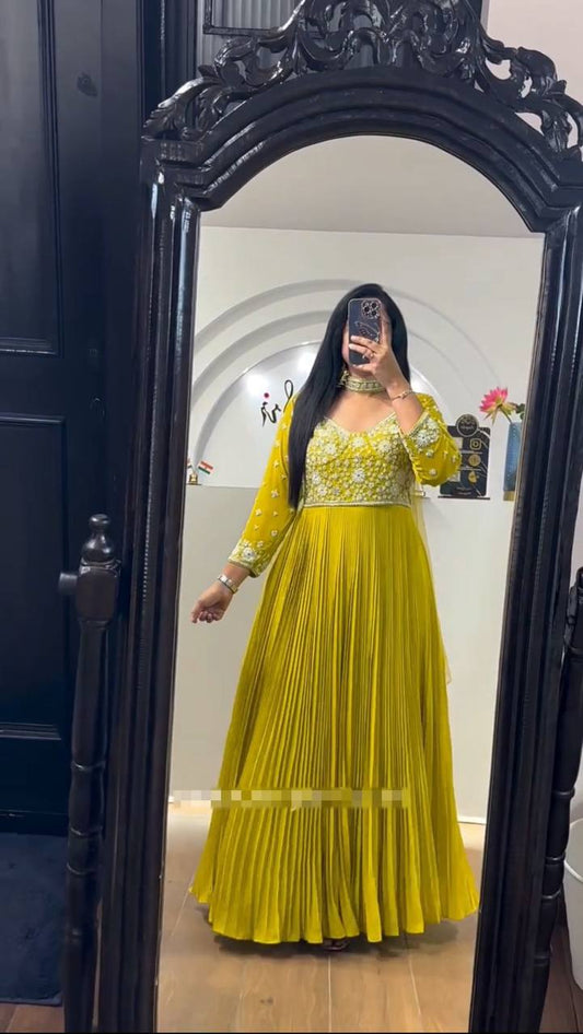 Glamorous Yellow Embroidered Georgette Haldi Wear Gown By WTW