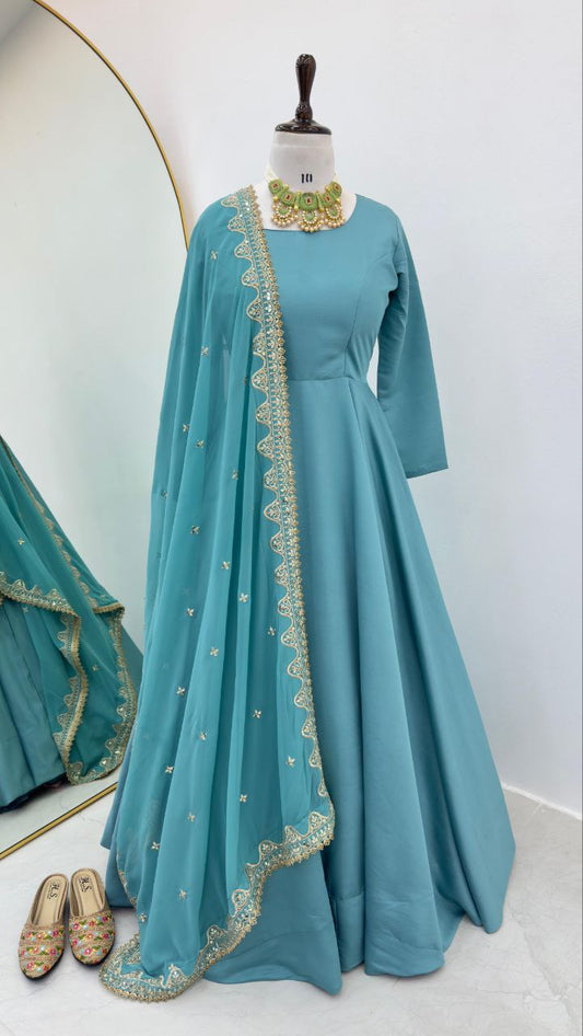 Sky Color Gown In Soft Twill Gold Fabric With Embroidery Work And Dupatta By WTW