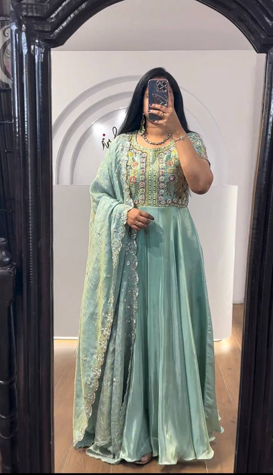 Superb Pista Green Color Chinnon Embroidery Sequence Gown By WTW