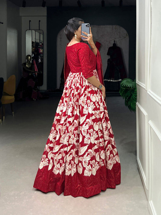 Sublime Red Color Tussar Silk Floral Printed Work Gown By WTW