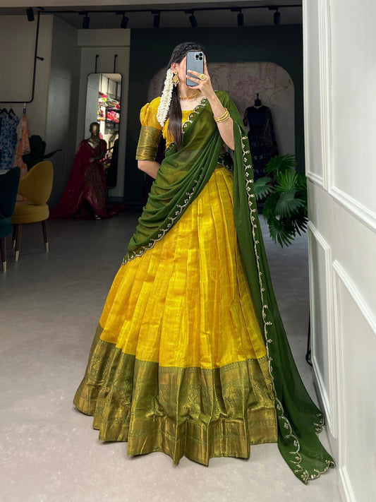 Art Silk Fabric Weaving Work Function Wear Glamorous Lehenga In Yellow Color ByWTW