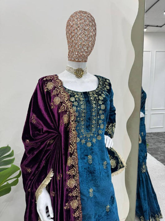 Rama Blue Velvet Sequence Embroidery Work Sharara Suit By WTW