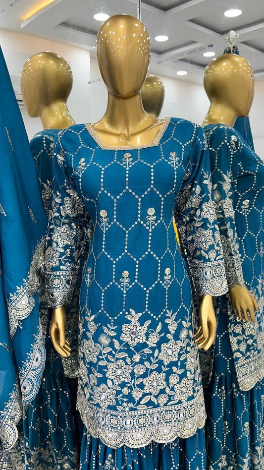 Rama Blue Chinon Silk Sequence Embroidery Work Sharara Suit By WTW