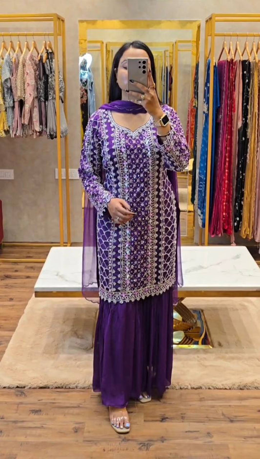 Purple Chinon Silk Sequence Embroidery Work Sharara Suit By WTW