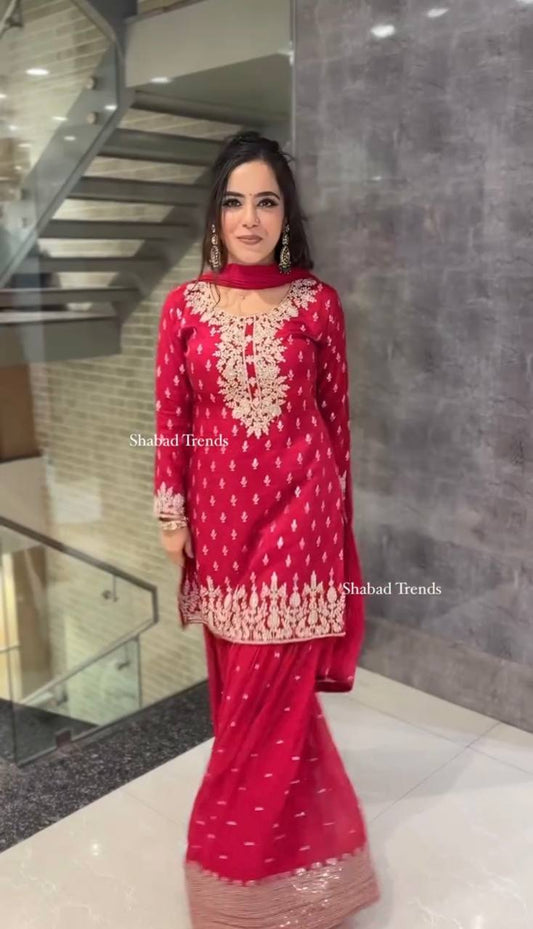 Red Faux Georgette Sequence Embroidery Work Sharara Suit By WTW