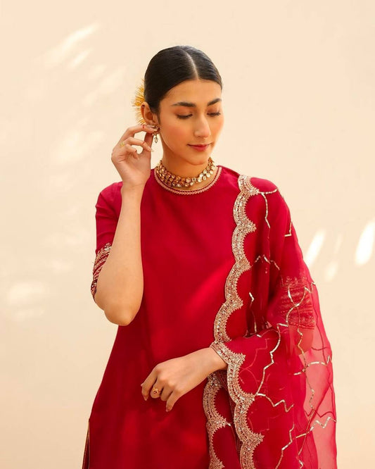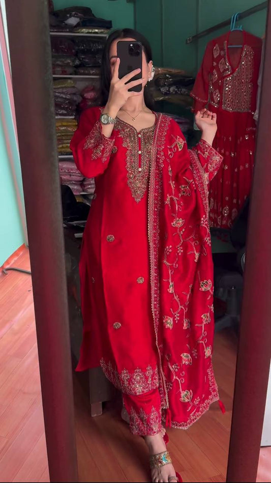 Red Chinon Silk Cording Dori Work Salwar Suit By WTW
