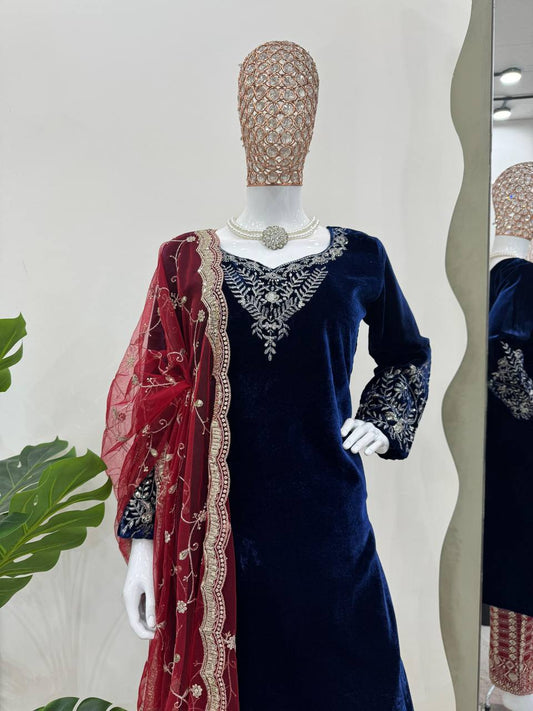 Special Navy Blue Color Viscos Velvet Thread With Sequnce Salwar Suit By WTW