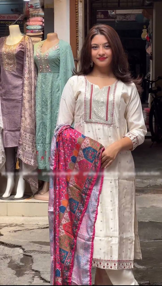 Special White Chinnon Silk Malty Thread Embroidery Salwar Suit By WTW