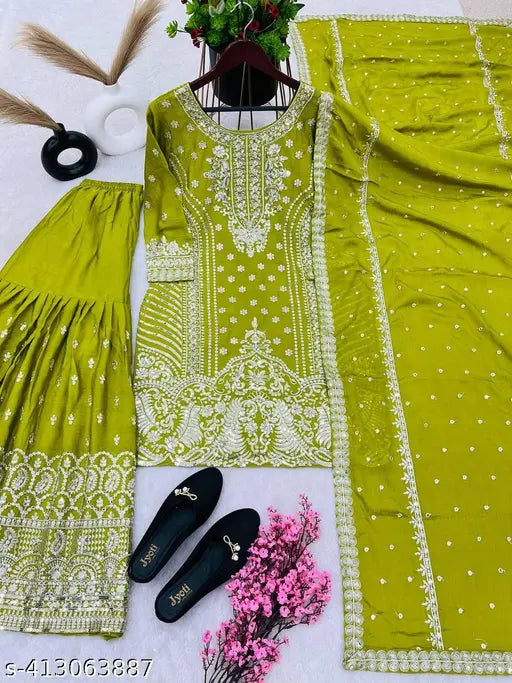 Stylish Green Color Chinnon Silk Embroidery Work Sharara Suit By WTW