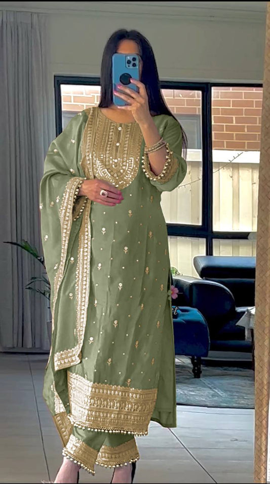 Superb Green Color Chinnon Silk Embroidery Sequins Sharara Suit By WTW