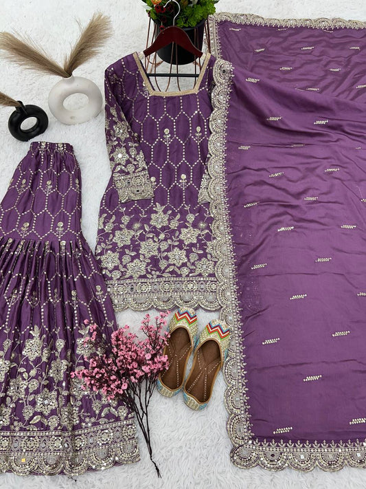 Stylish Violet Color Chinnon Silk Embroidery Work Sharara Suit By WTW