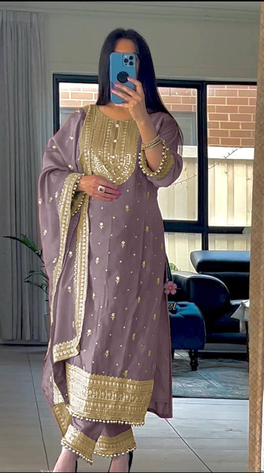 Superb Purple Color Chinnon Silk Embroidery Salwar Suit By WTW