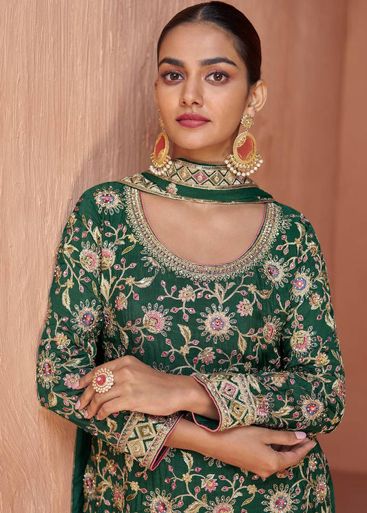 Bottle Green Sequins Embellished Chinon Palazzo Suit Set By WTW