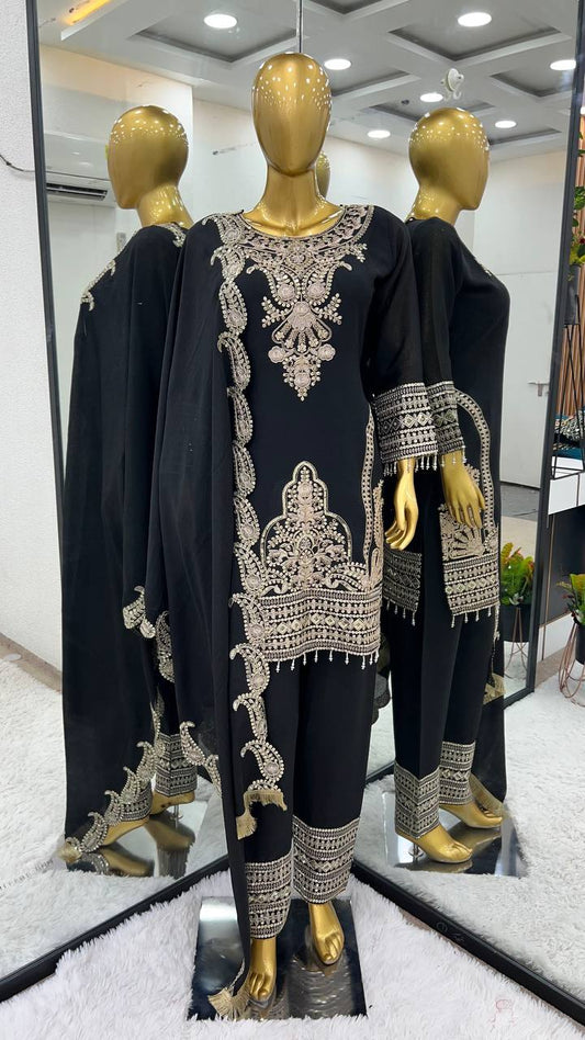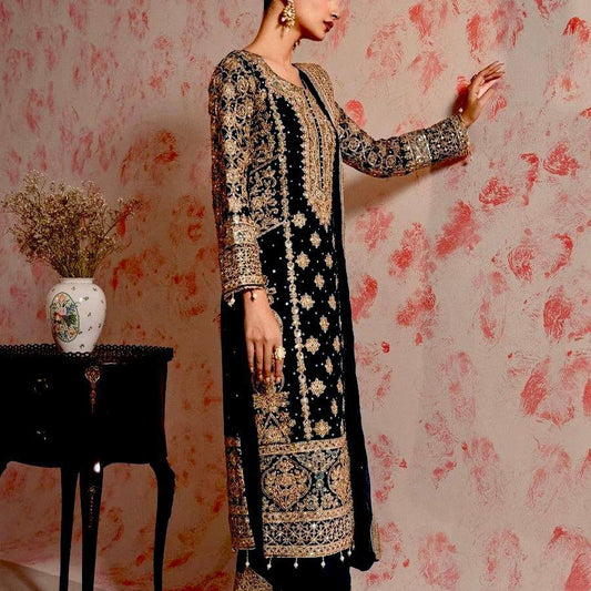 Fine Black Color Pure Chinnon Silk Embroidery Salwar Suit By WTW