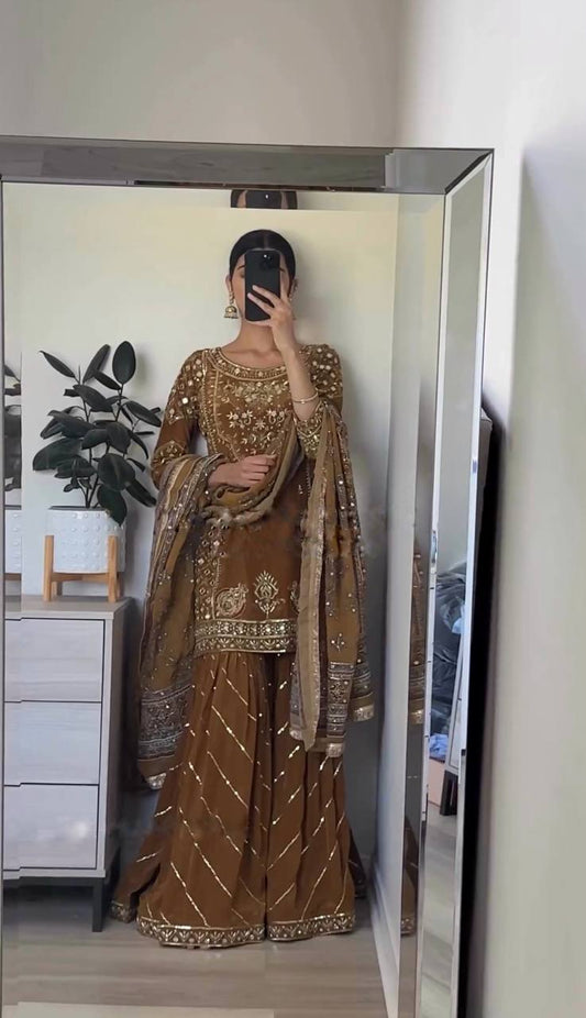 Fine Coffee Color Chinnon Silk Embroidery Sequins Sharara Suit By WTW