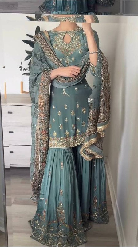 Grand Blue Color Chinnon Embroidery Sequence Sharara Suit By WTW