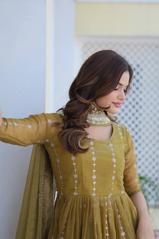 Fully Stitched Chinon Gown Pant And Dupatta With Embroidery Work By WTW