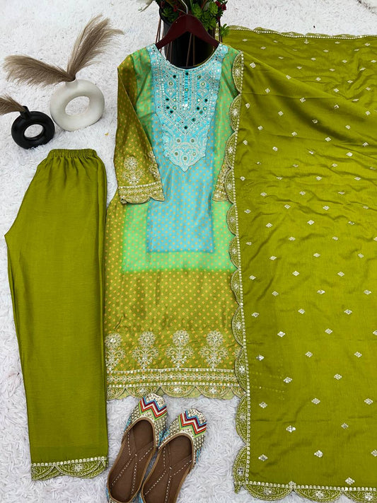 Olive Green Embroidered Chinon Suit Set With Dupatta By WTW