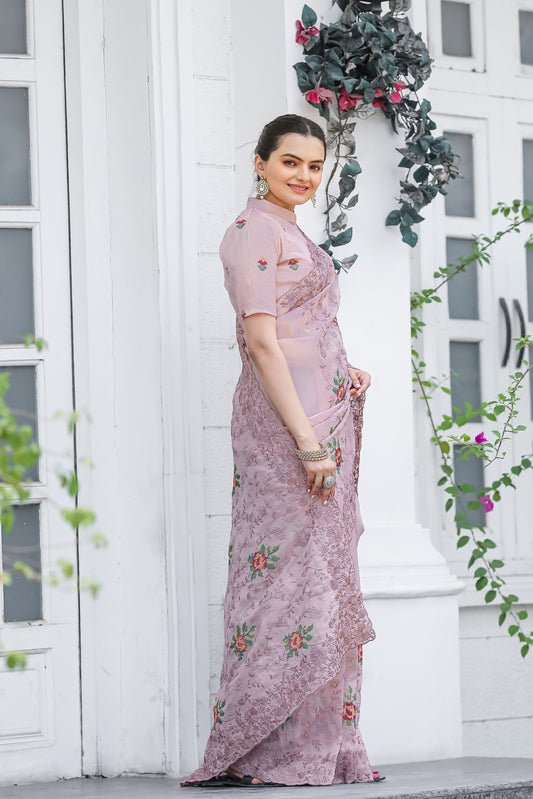 Pink Thread Embroidered Chiffon Saree Set By WTW