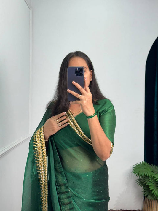 Classic Green Color Burberry Foil And Zari Embroidery Work Saree By WTW