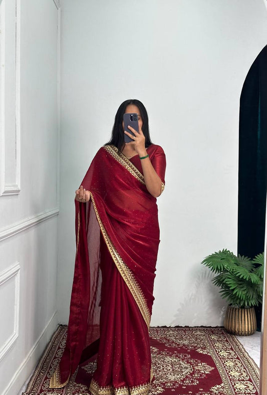 Classic Red Color Burberry Foil And Zari Embroidery Work Saree By WTW