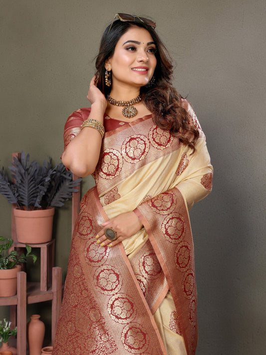 Cream Banarasi Silk Saree With Blouse Piece By WTW