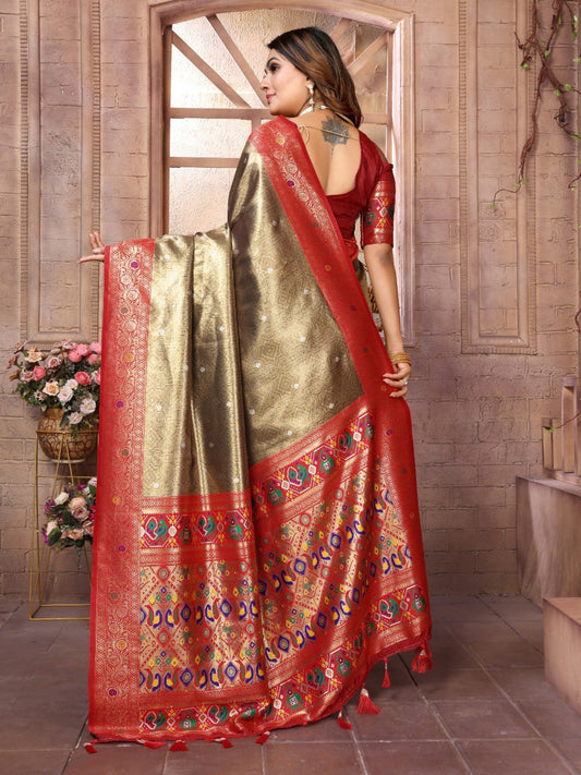 Outstanding Banarasi Tissue Silk Mehndi And Red Color Saree By WTW