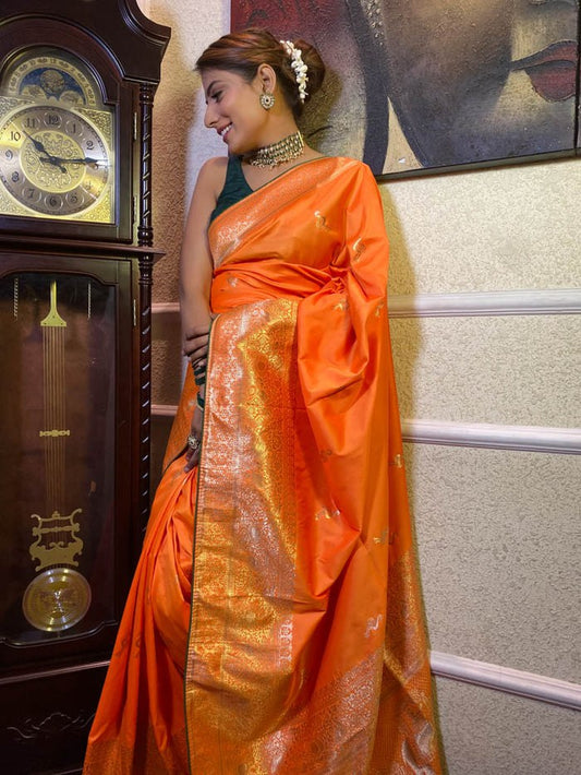 Orange Banarasi Silk Saree With Blouse Piece By WTW