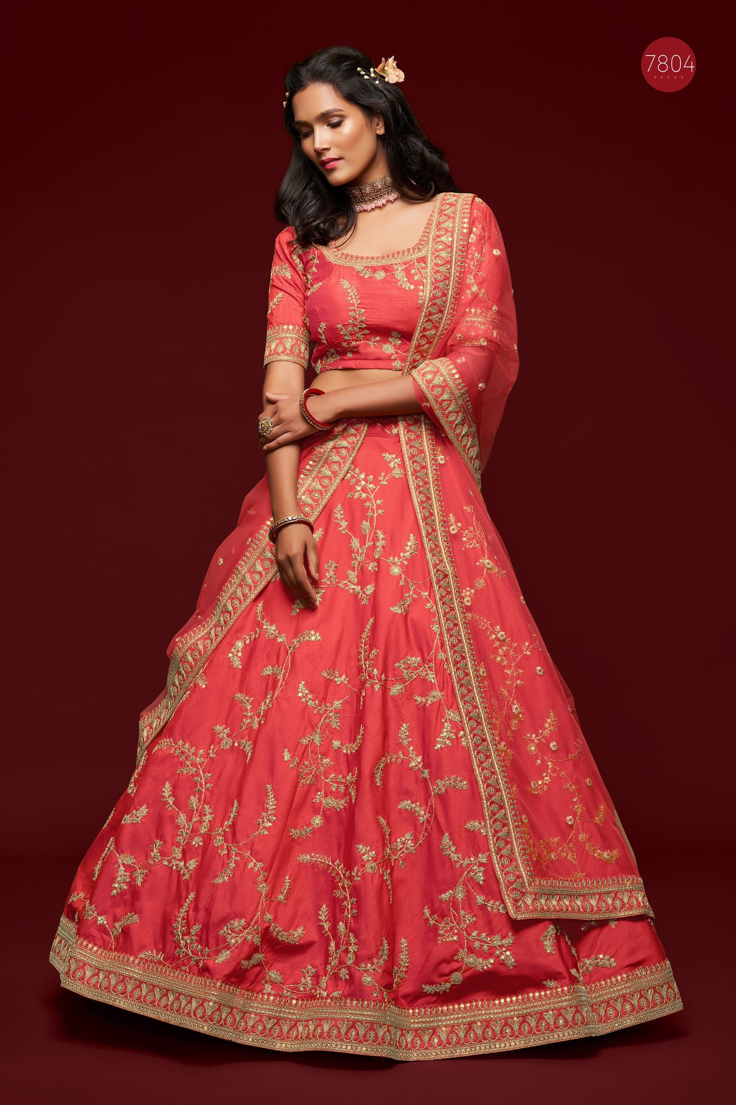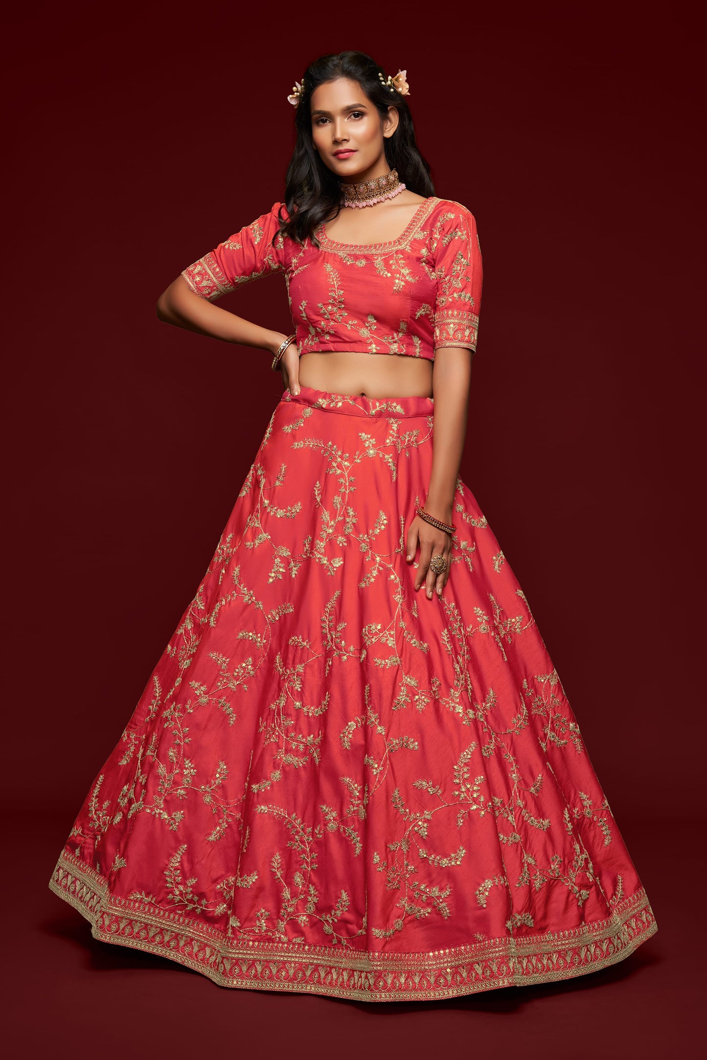 Coral Red Thread Embroidery Art Silk Wedding Wear Lehenga Choli By WTW