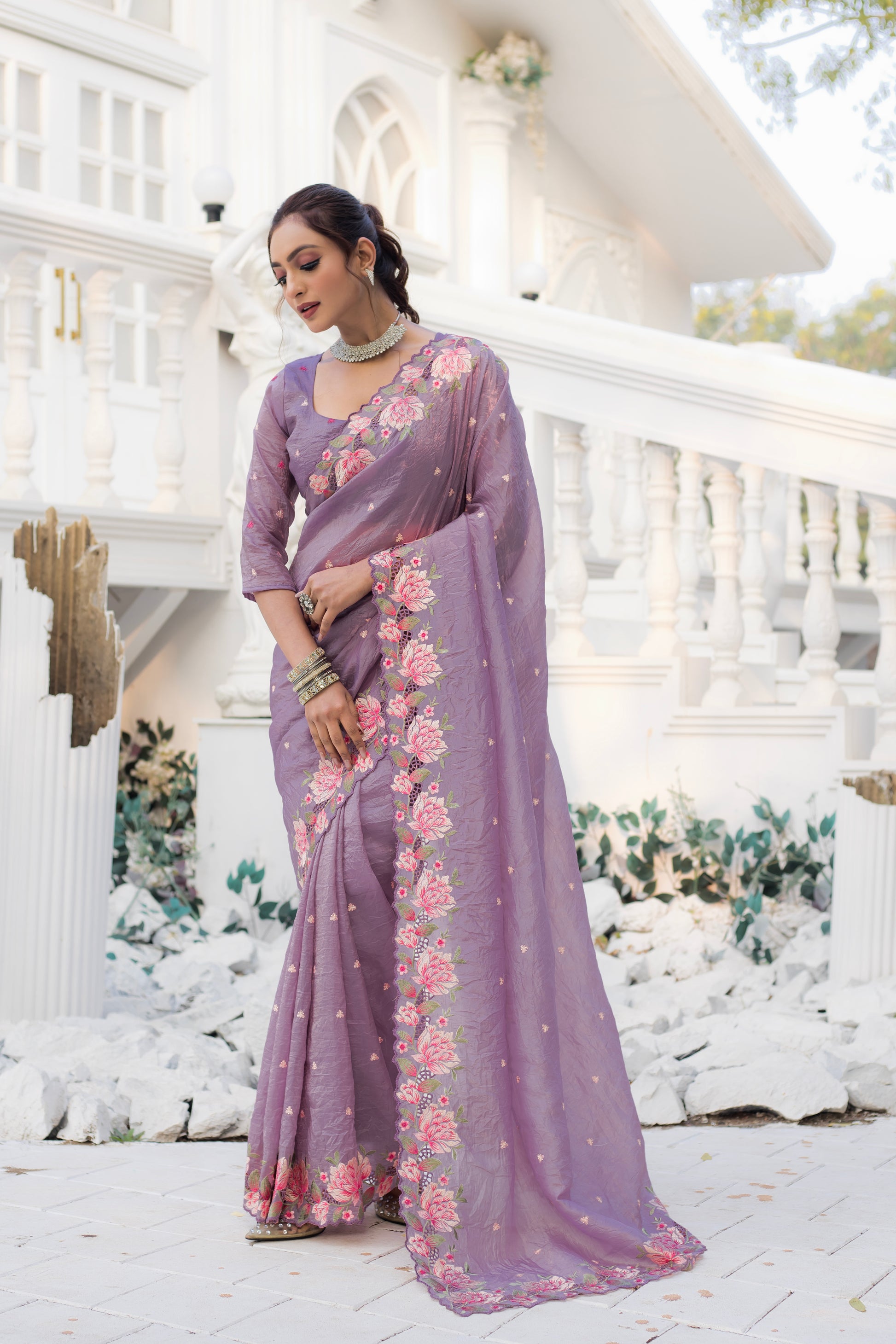 Crush Silk Lavender Party Wear Embroidery Work Saree By WTW