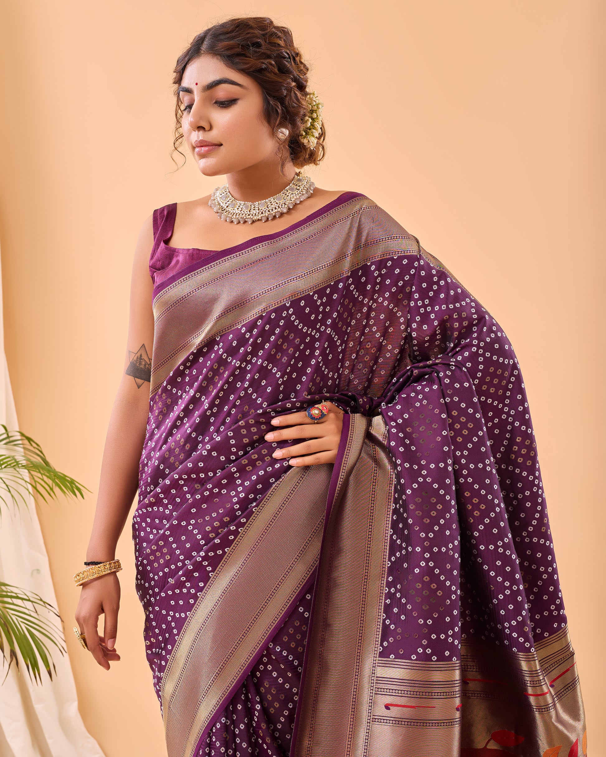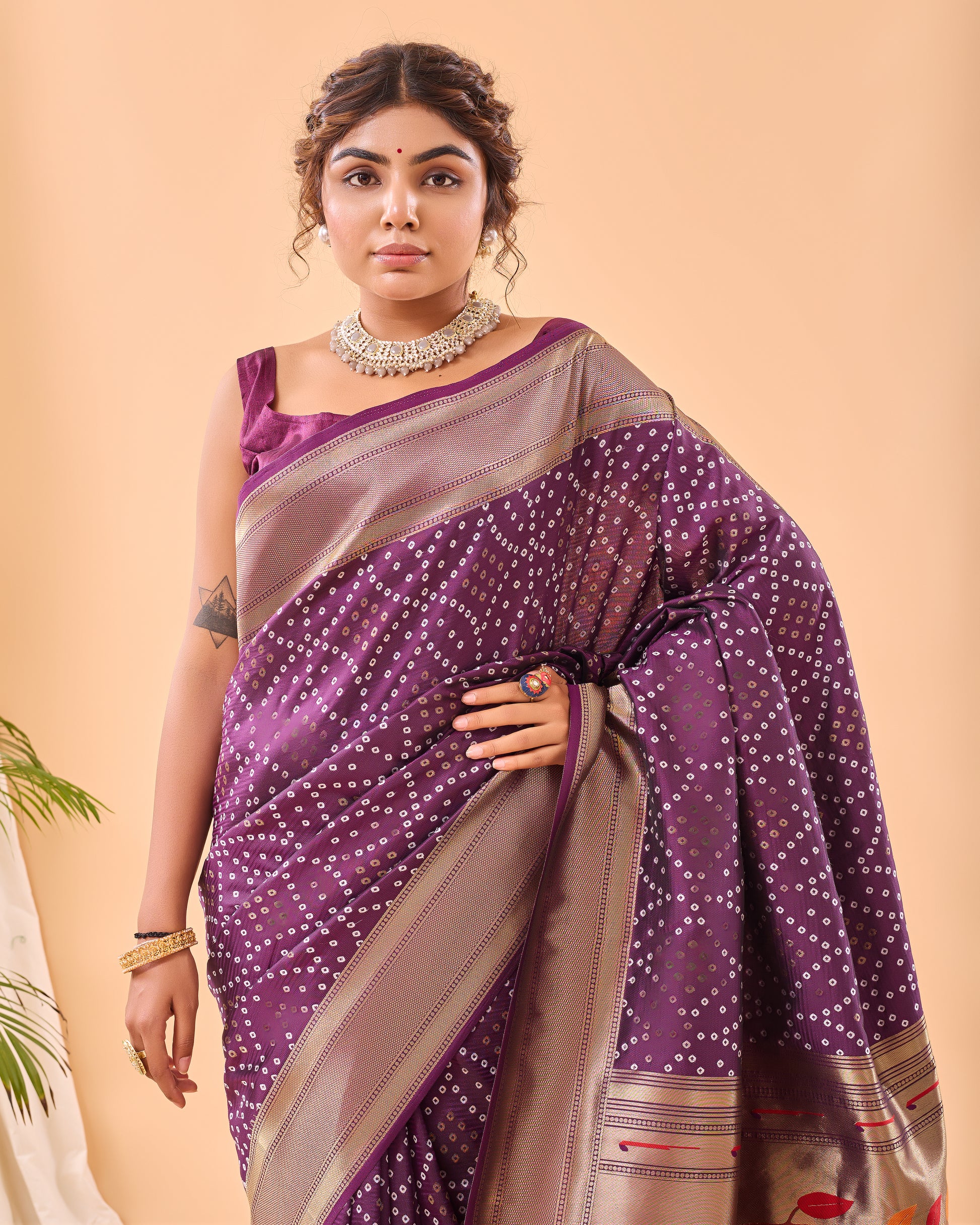 Fabric: Pure heavy bandhani weaving saree with a Paithani pallu and border on both sides. Bandhani is a traditional tie-and-dye technique, often with vibrant patterns, while Paithani is a luxurious silk weaving style with intricate designs, especially on the pallu and borders.